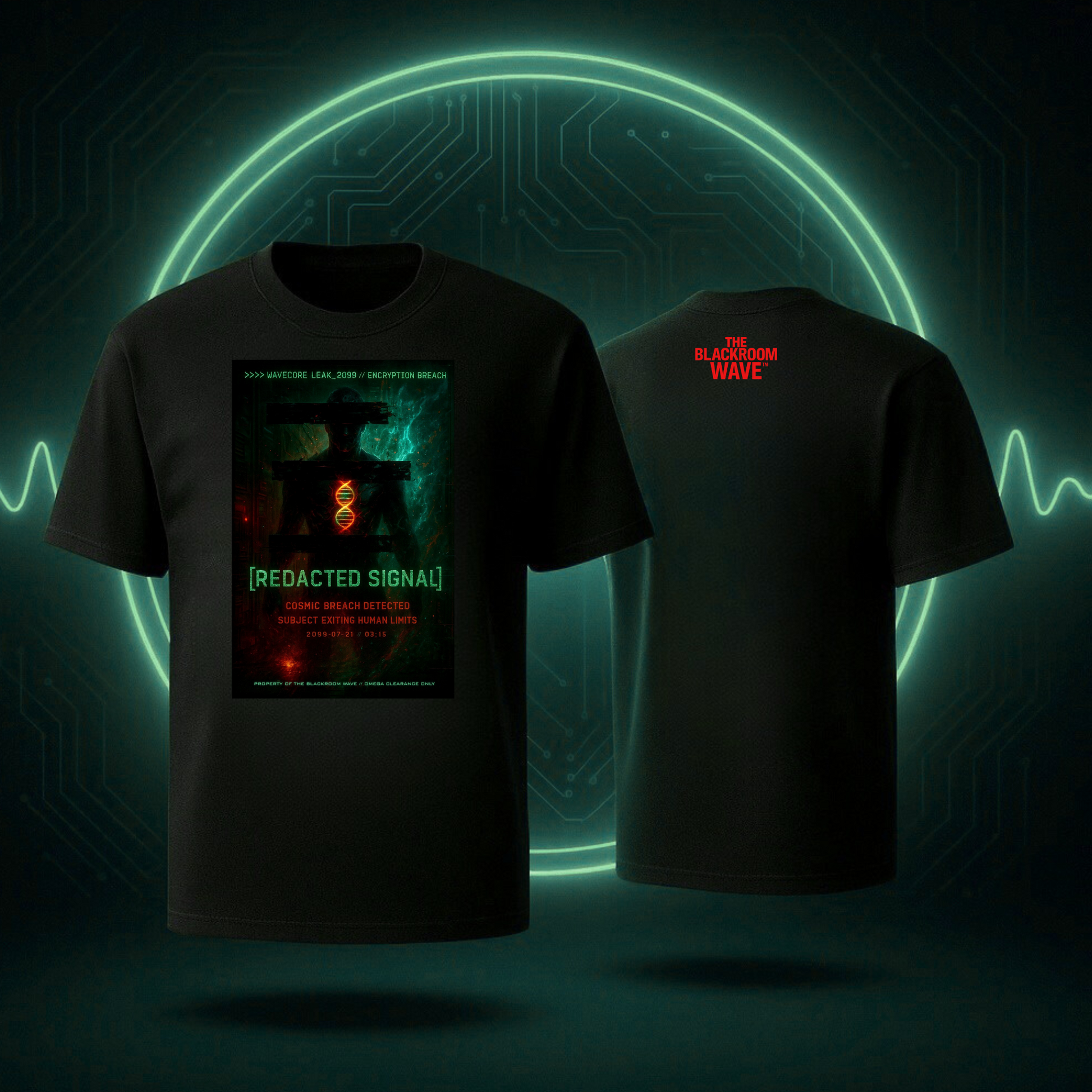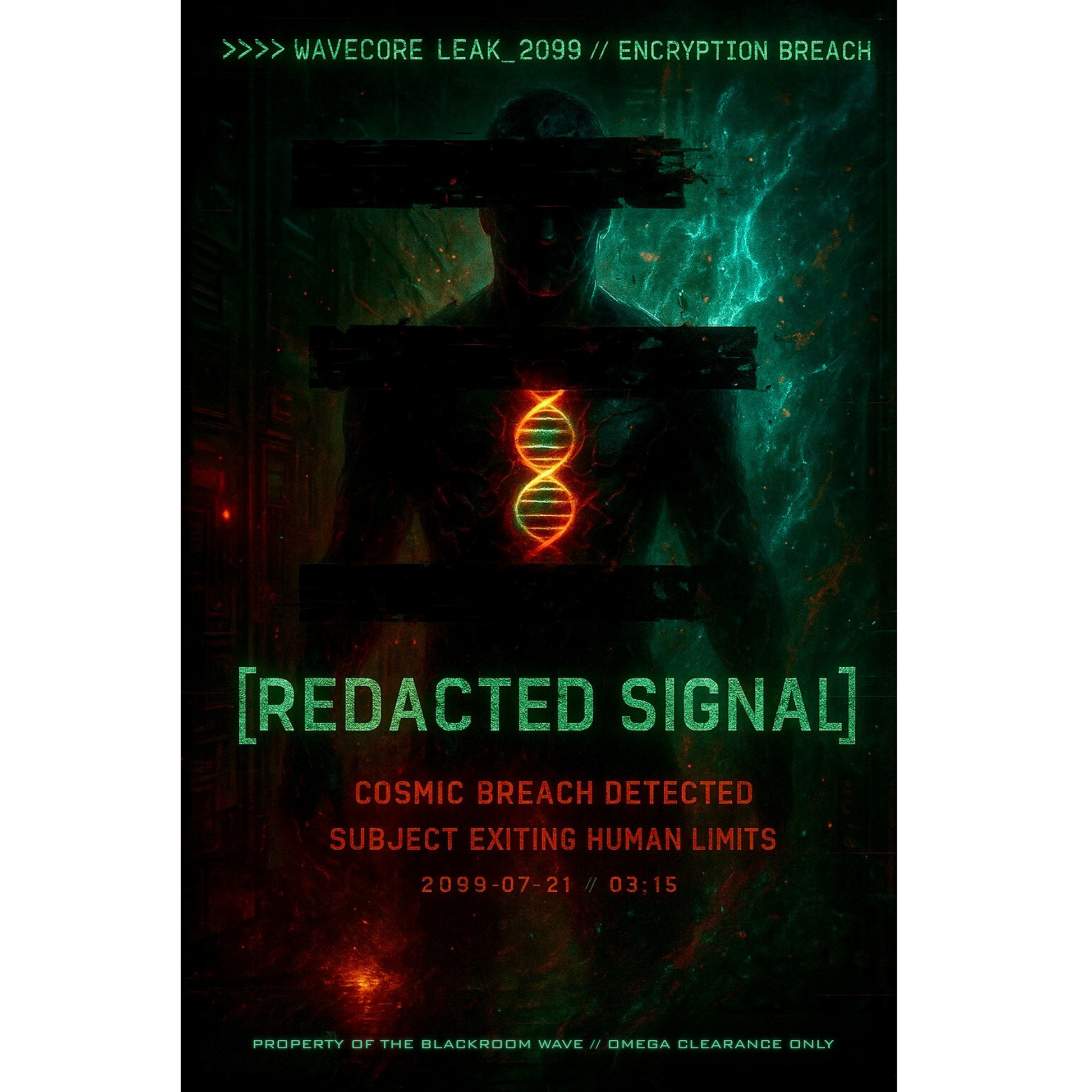 Every line of text, every glow effect, every redacted signal is designed like a file leak from another dimension. The blackout eyes, the cosmic breach, the “Property of THE BLACKROOM WAVE™” stamp at the bottom — it all feels like something that slipped out of a classified database and landed in your hands.